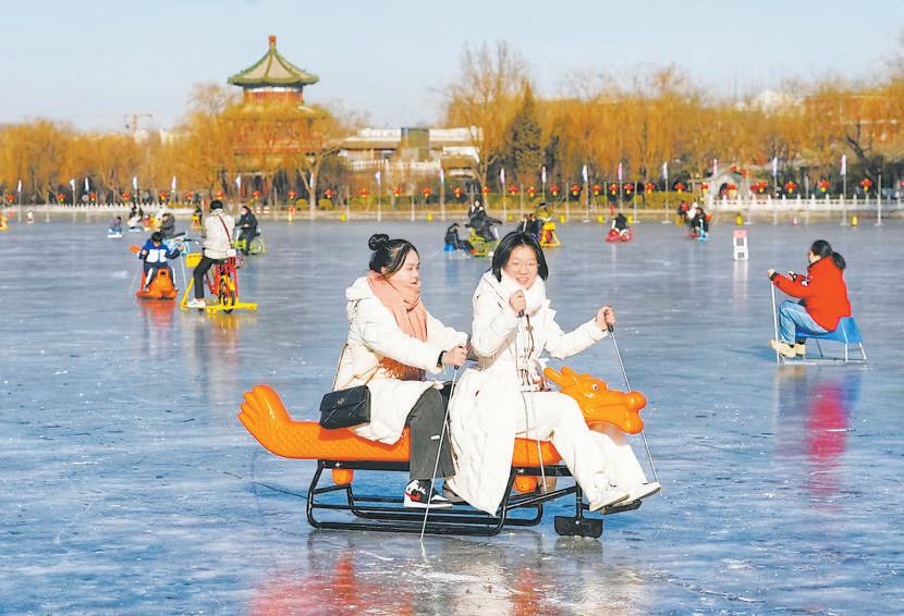 昨天,什刹海后海冰场开门迎客。游客在冰面上畅玩冰车。 本报记者 方非摄